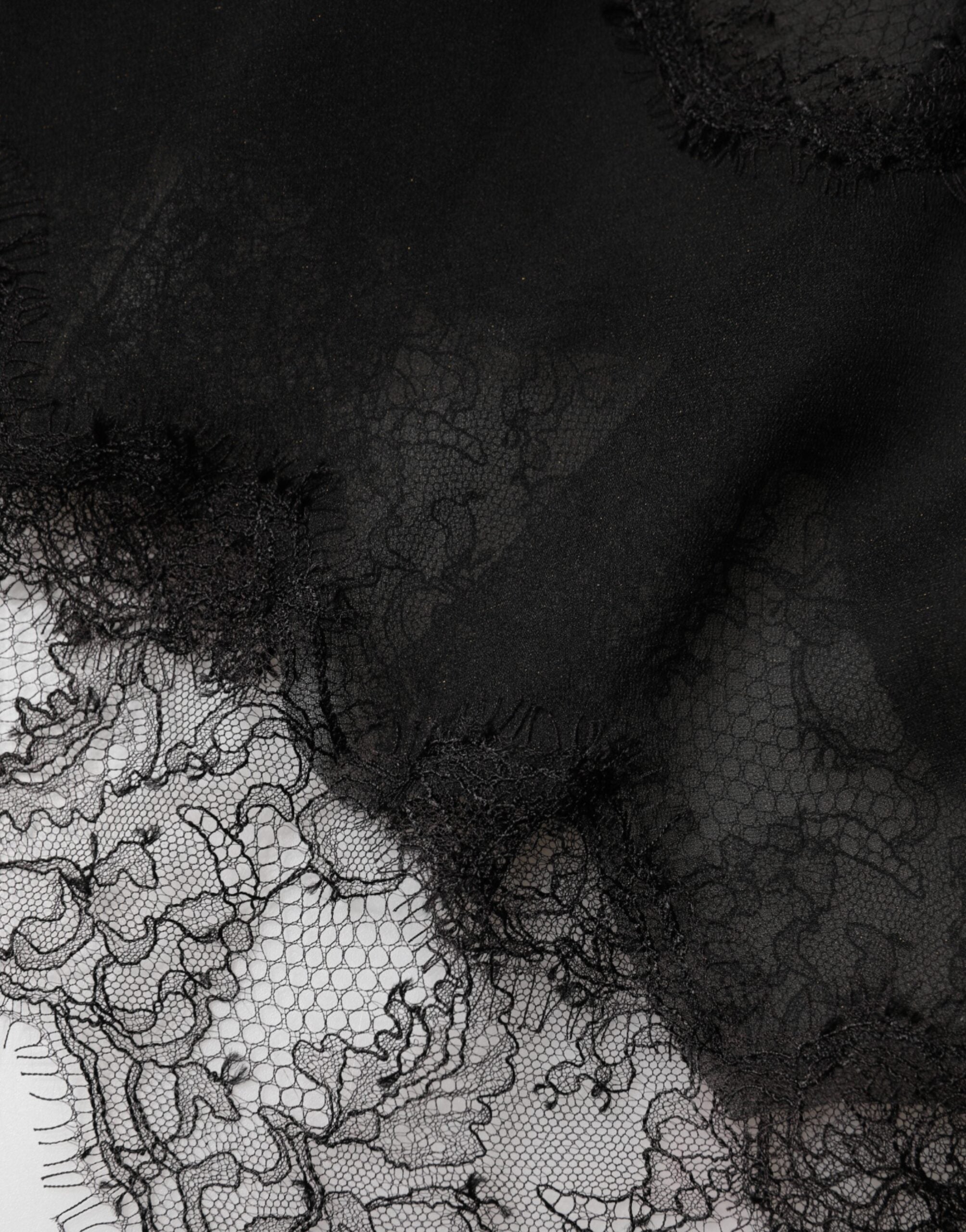 black silk shirt. Featuring delicate floral lace detailing, it offers a luxurious and feminine fit. Perfect as intimate lingerie or layered under elegant nightwear, this piece combines soft silk comfort with sophisticated Italian design.
