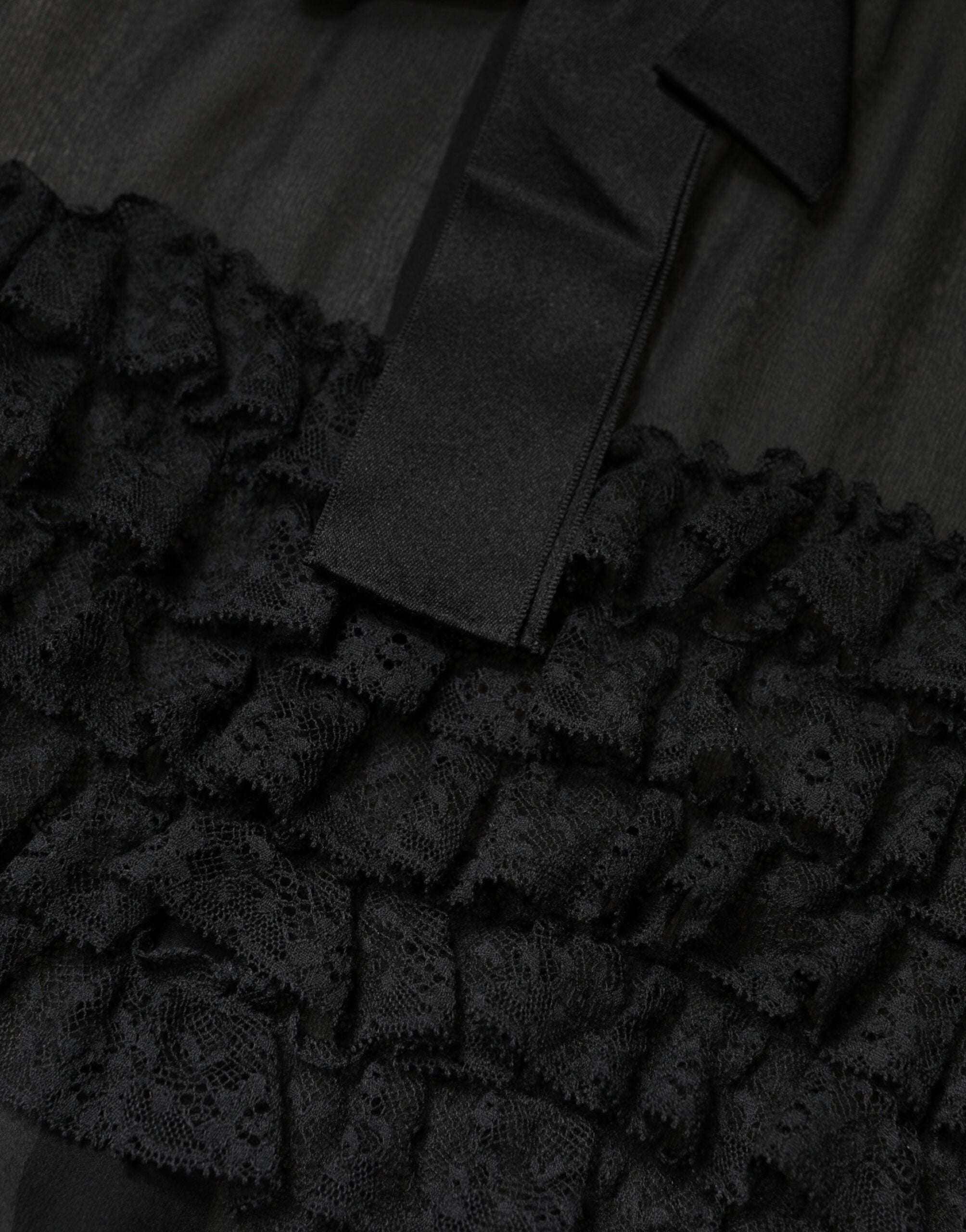 blouse features a sheer black fabric with delicate ruffle detailing and a feminine tie-neck design. Perfect for sophisticated office looks or evening ensembles, it pairs beautifully with tailored trousers or skirts, offering a refined yet playful Italian-inspired style.